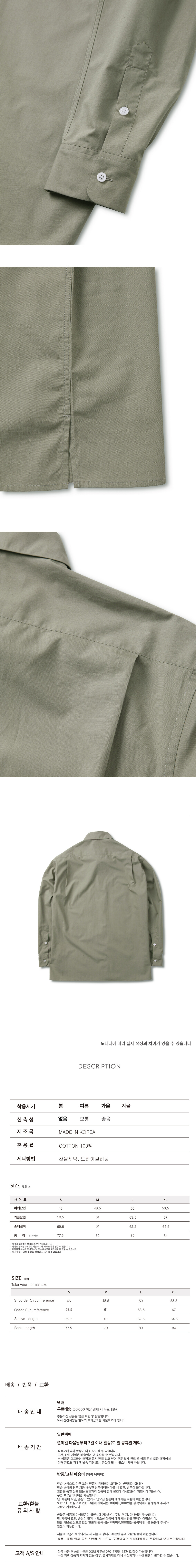최상의 품질이 될 수 있도록 국내 최고의 셔츠메이커(공장)에서 제작된 제품으로 18땀의 봉제와 단추의 견고함과 편리성을 위한 뿌리감기 디테일 적용, 비접착 심지 사용으로 원단과의 이질감 제거, 독일 GUTERMANN사의 봉제사 사용으로 작은 부자재부터 하나하나 최고의 퀄리티로 봉제 되었습니다.