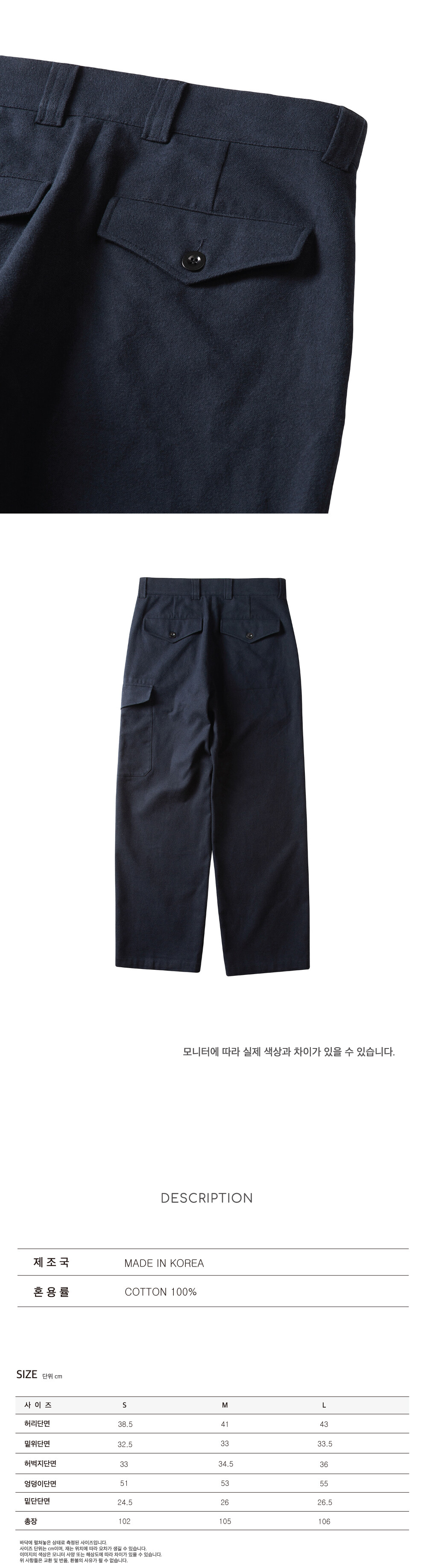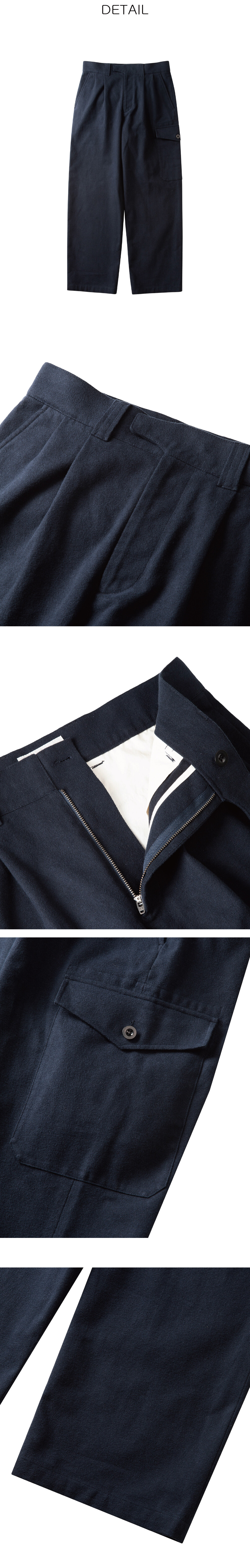 60년대의 영국 해군 울 카고 팬츠와 52년도 영국군 울 트라우져를 기반으로 오비(허리단)과 플리츠 방향 등을 변형하여 현대에 맞게 재해석 하였습니다. 허리 오비의 독특한 모양의 꼬리가 인상적인 제품입니다.