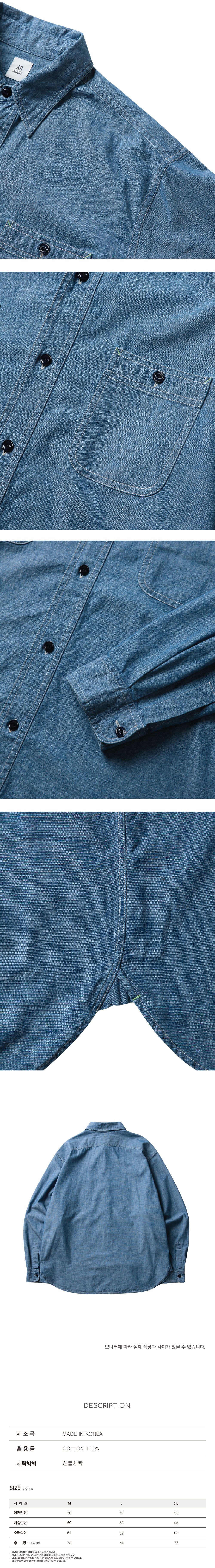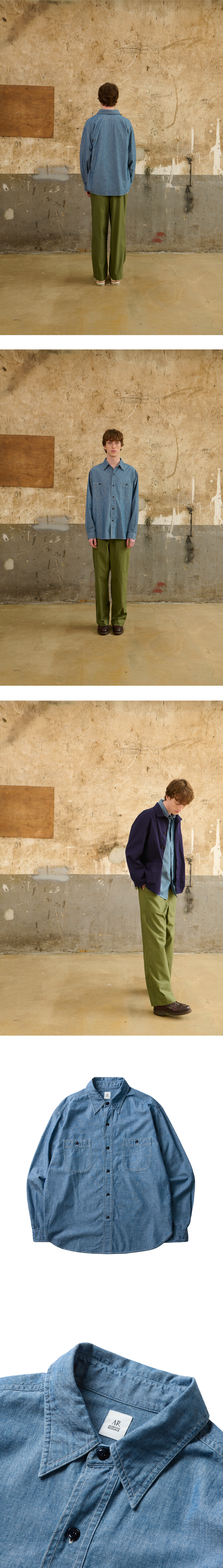 JAPAN BLUE CO., LTD 에서 구형 제직기를 통해 천천히 정성껏 짜아낸 셀비지 샴브레이로 데드스톡의 빈티지 샴브레이 셔츠를 샘플링하여 조금 색이 바랜듯한 황색기미가 있는 색상이 특징이며 로프다잉을 통해 염색하였기에 세탁을 할수록 새로로 색감이 빠지는 것이 특징입니다.