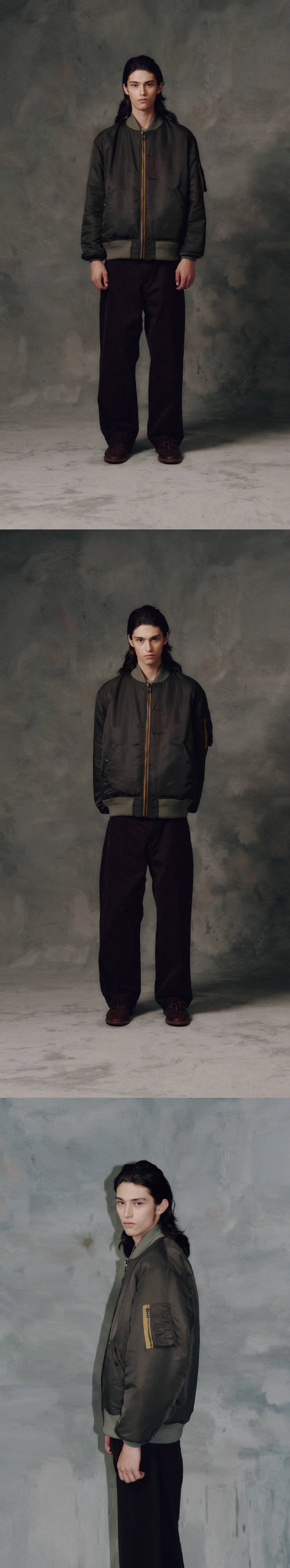 카라립, 밑단 립, 소매립은 AW소재로 울과 아크릴, 나이론이 잘 혼방되어 터치감, 내구성, 보온성이 좋으며 오리지널 빈티지보다 1합을 더 보강하여 직접 제직하였습니다. 또한, 소매 립의 경우 오리지널 소매(원통형)시보리를 제직하여 사용하였습니다. 오리지널 양말형 시보리를 사용한 이유는 빈티지 고증도 있지만 착용시 소매가 자연스럽게 들어가 기장이 길어도 MA-1의 가장 이상적인 연출이 가능합니다.