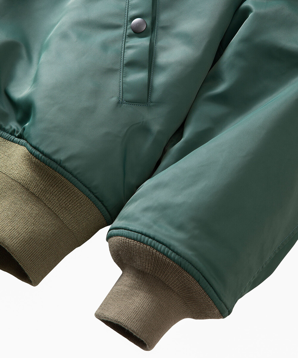또한, 소매 립의 경우 오리지널 소매(원통형)시보리를 제직하여 사용하였습니다. 오리지널 양말형 시보리를 사용한 이유는 빈티지 고증도 있지만 착용시 소매가 자연스럽게 들어가 기장이 길어도 MA-1의 가장 이상적인 연출이 가능합니다.