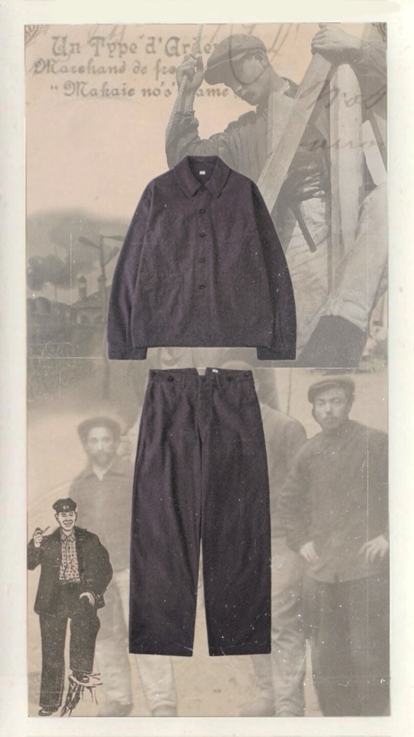 1940~50년대 프렌치 워크웨어에서 영감을 받아, V자 뒷트임, 멜빵 단추, 비조, 포켓, 버튼, 스티치, 뎅고 등 상징적인 디테일을 차용해 오리지널리티를 유지했습니다.