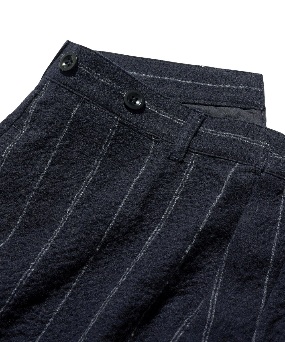 원단은 자켓과 동일한 40/2 면사와 2/60 울사를 사용해 제직한 일본산 평직 소재입니다. 마무리 공정에서 와셔 가공을 거치며, 면과 울의 서로 다른 수축률로 인해 표면에 자연스러운 요철감이 형성됩니다.