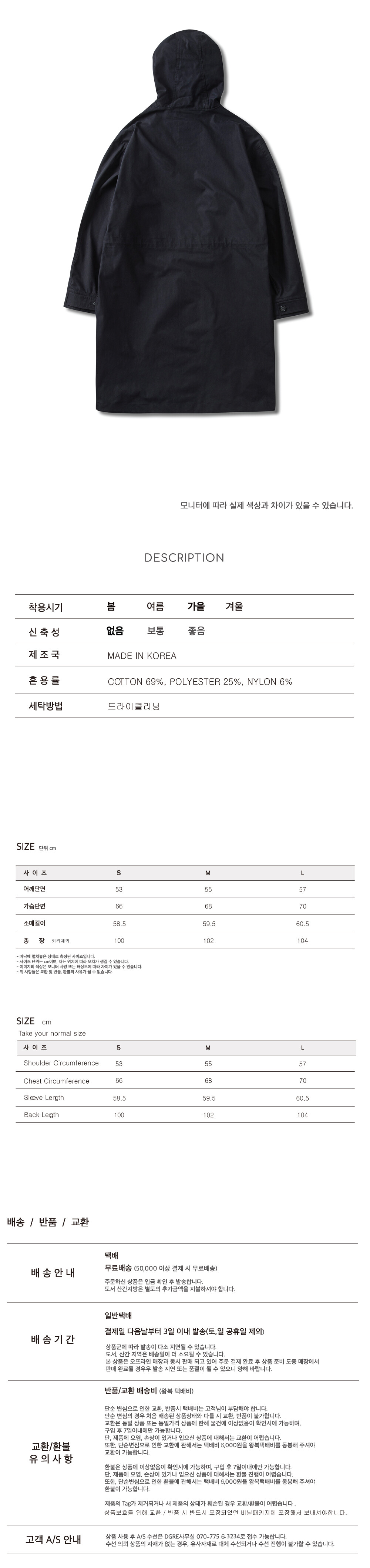 A핏의 여유 있는 오버사이즈 파카입니다.