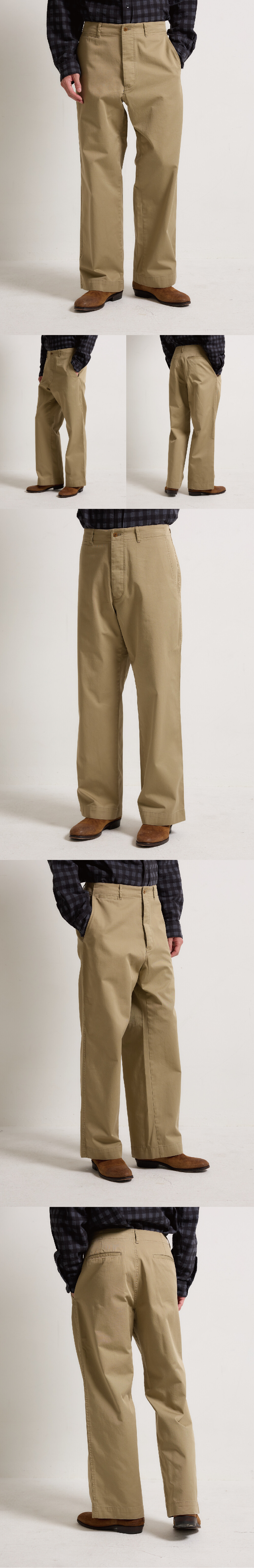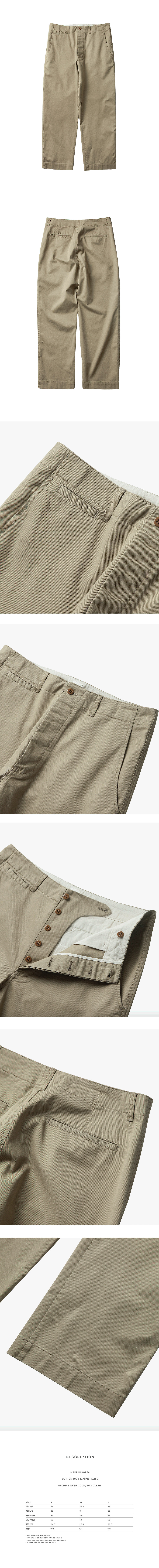 40년대 오피서 팬츠를 재해석해서 만든 팬츠입니다. 고밀도 치노 원단 소재에 와이드 핏으로 떨어지는 실루엣과 강한 바이오 워싱으로 인한 빈티지함이 살아있는 오피서 치노 팬츠입니다.