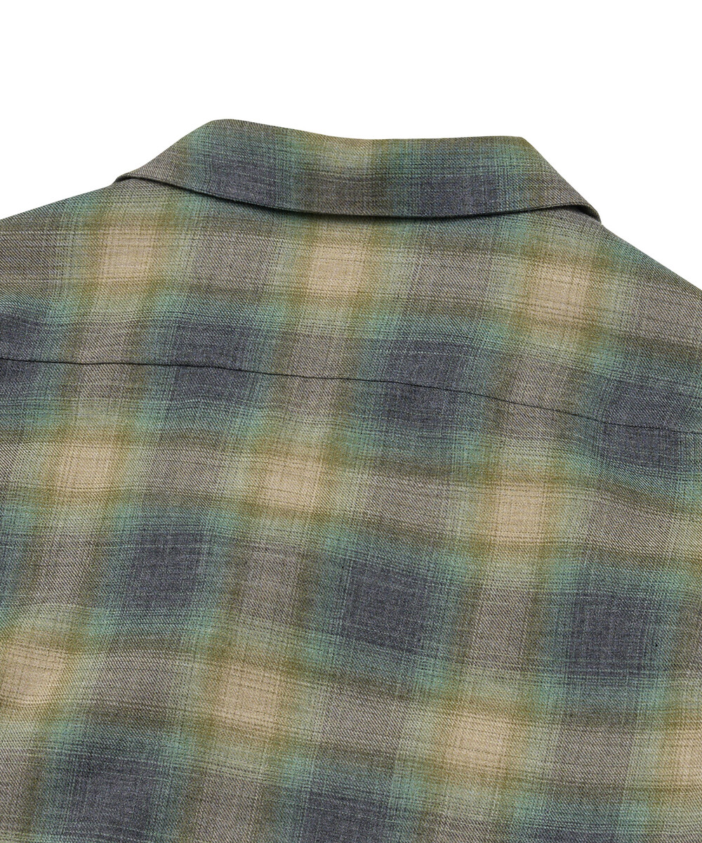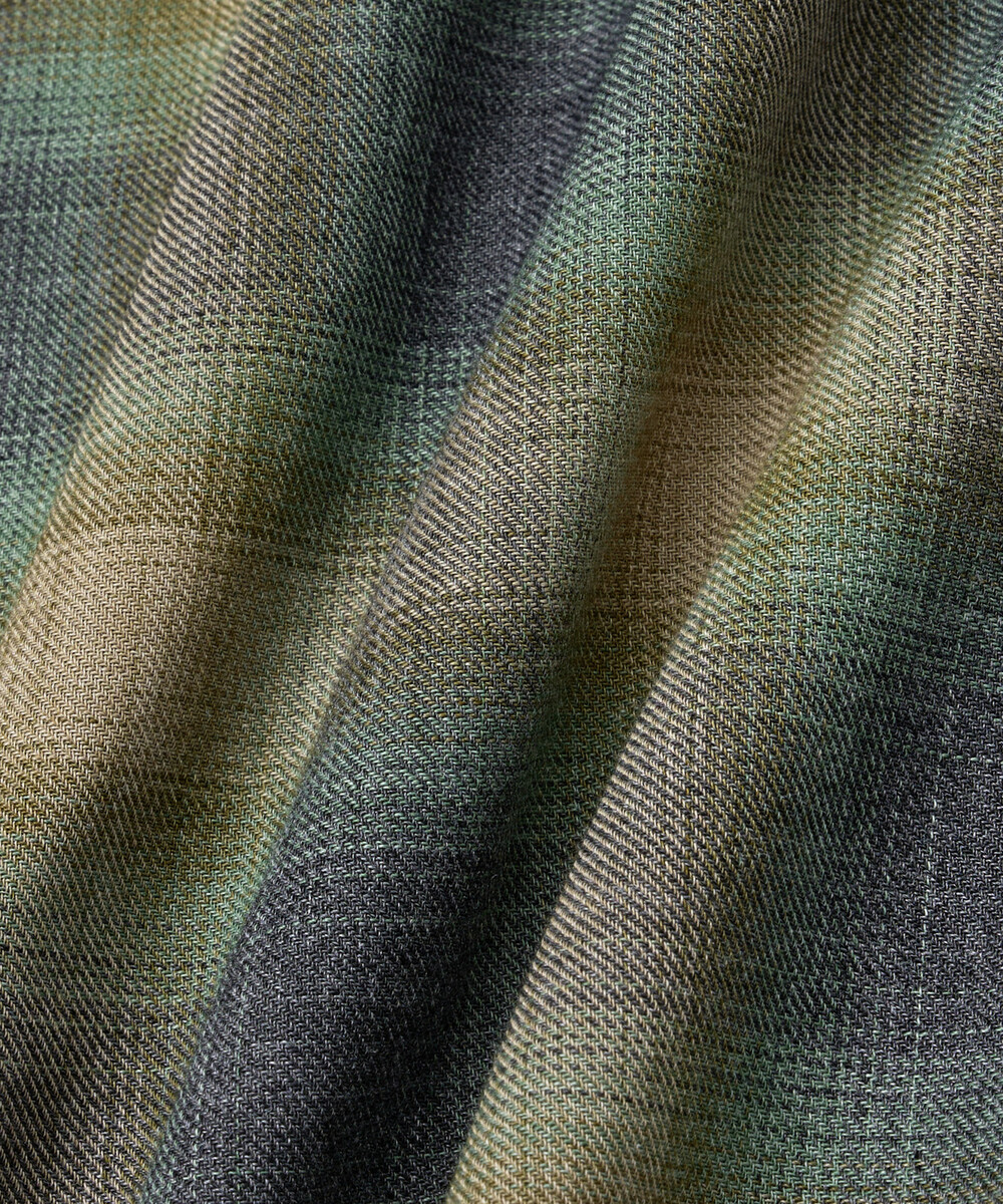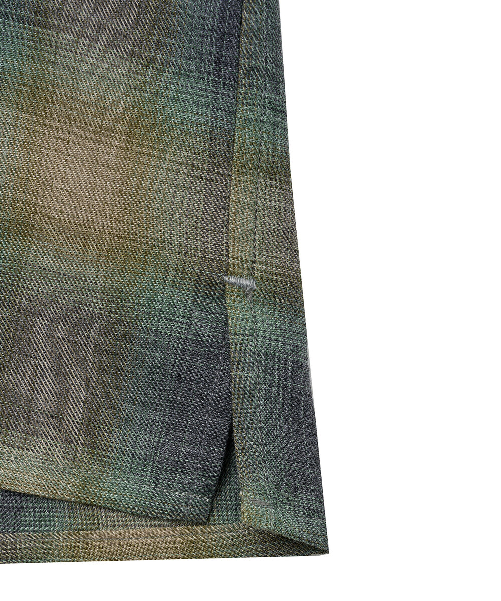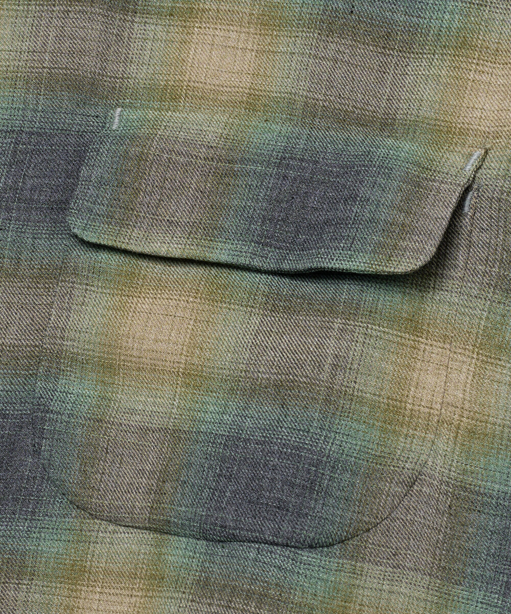 원단은 일본산 리사이클 폴리에스터 65%, 오가닉 코튼 35% 혼방 소재를 사용했으며, 빈티지 옴브레 체크를 바탕으로 제직한 원단입니다.