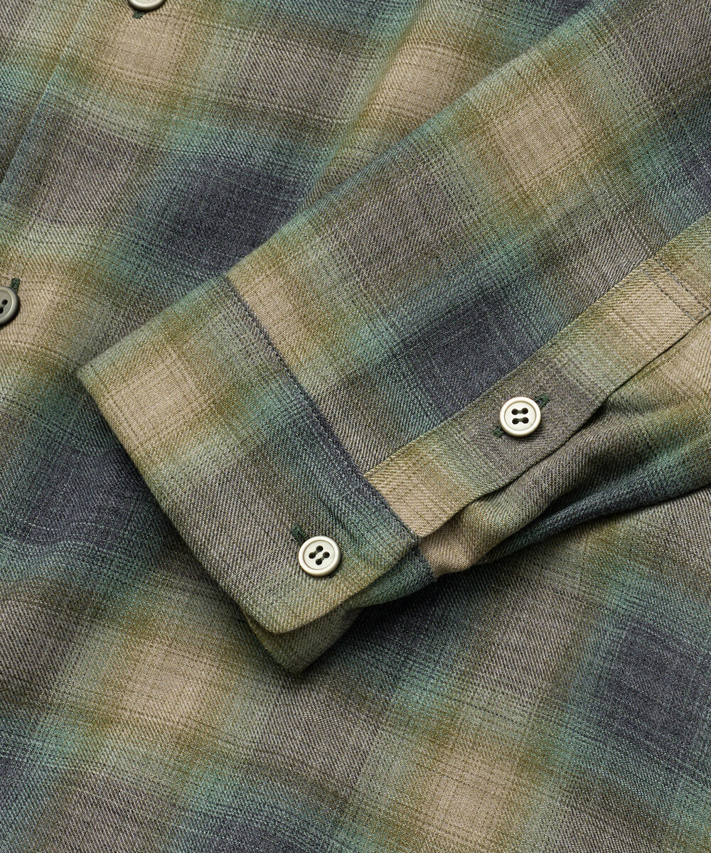 The fabric is a Japanese-made blend of 65% recycled polyester and 35% organic cotton, woven with a vintage ombré check pattern.