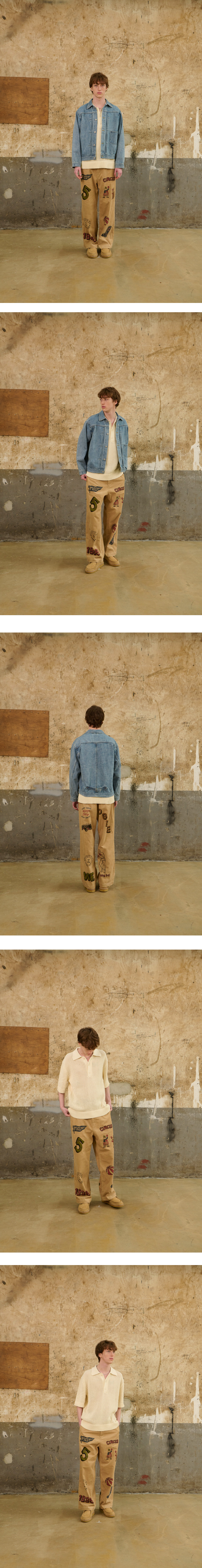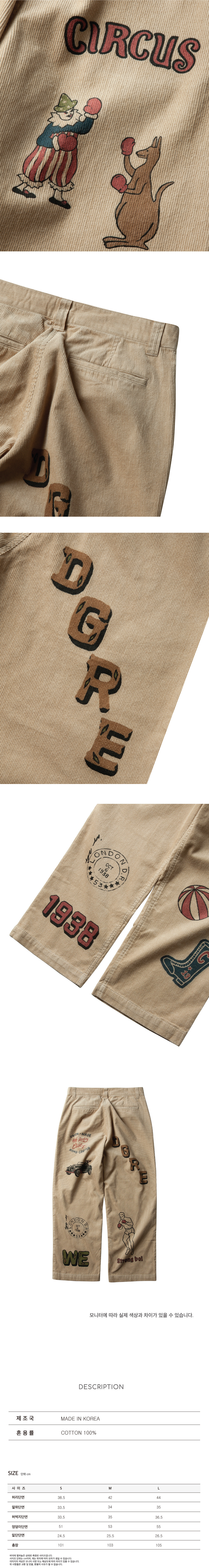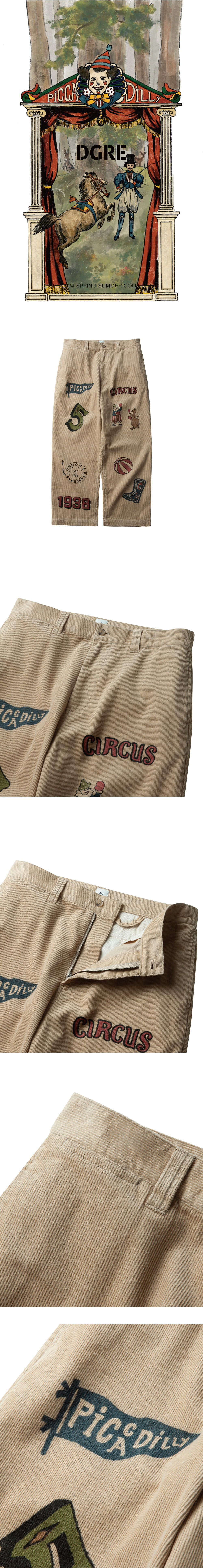 팬츠 위의 그림들은 피카델리 서커스단의 소품, 마크, 동화 속의 등장하는 악마, 경기 중인 맨손복서 등을 표현했습니다.