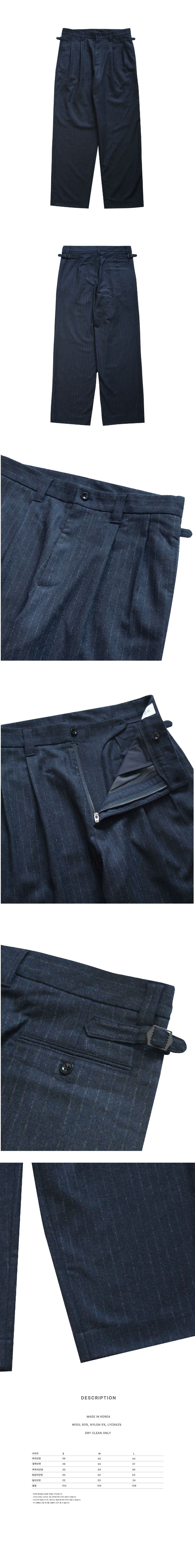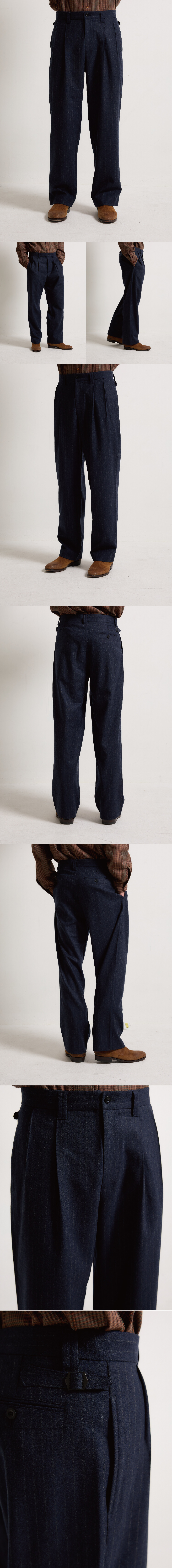30년대 유럽 빈티지 팬츠를 기반으로 재해석된 제품으로 오비끝의 굴림과 뒷포켓의 스티치 그리고 벨트루프 모양이 특징입니다.